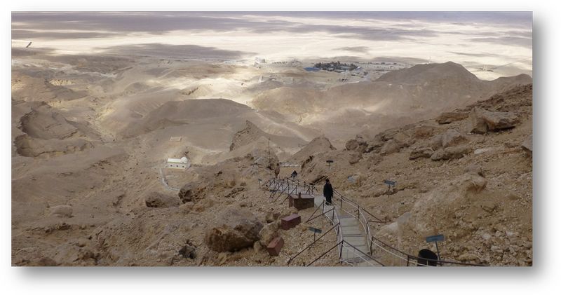 На фотографии, сделанной приблизительно с места расположения кельи святого Антония, с середины горы, в которой он, собственно, и жил, – вдалеке виднеется небольшой оазис, рядом с которым и располагается монастырь святого Антония. Это, в частности, является материальным свидетельством того, что, в принципе, источник воды был недалеко от места подвига преподобного, но пустыня вокруг Антония была абсолютно безжизненна, как и сейчас.