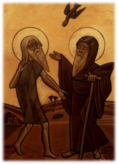 Одним из первых таких «монахов до монашества», наверное, является святой Павел Фивейский. Мы его считаем даже неким первым монахом, но он не был первым исторически. Скорее, одним из первых, о ком мы встречаем соответствующее описание, житие, которое подобно житию всех других монахов. В житии Павла Фивейского, написанном блаженным Иеронимом, мы видим трогательную встречу: уже достигший преклонных лет Антоний Великий идет через пустыню, по откровению свыше, чтобы встретиться с почти что 136-летним Павлом, который жил вдали от мира. По блаженному Иерониму, он более полувека прожил в одиночестве и даже спрашивал Антония: что там, в миру, происходит. «Расскажи мне, пожалуйста, как живет теперь род человеческий? – спрашивал святой Павел. – Возвышаются ли в старых городах новые крыши, какой властью управляется мир? И остался ли кто-либо увлеченный прелестью демона?» [1] Мы видим, что в их присутствии совершается чудо: ворон, который приносит Павлу укрухи хлеба, в тот момент, когда приходит святой Антоний, приносит двойную часть. После смерти святого Павла Фивейского, в память об этом подвижнике святой Антоний сохраняет его милоть.