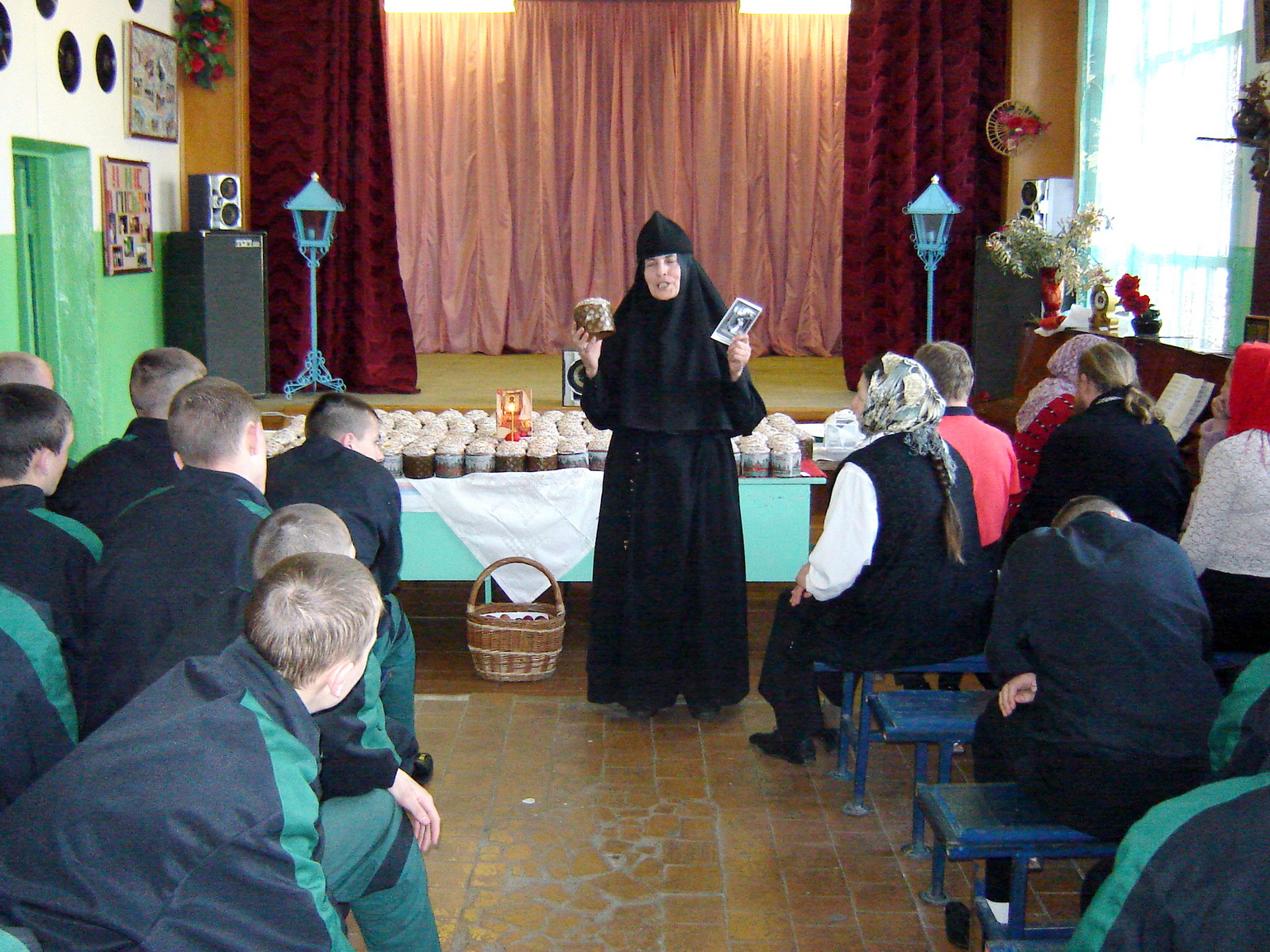 11.00 – 11.45 – общая трапеза, сопровождающаяся чтением творений святых отцов, житий святых, жизнеописаний и трудов новомучеников и исповедников Российских и современных подвижников благочестия.