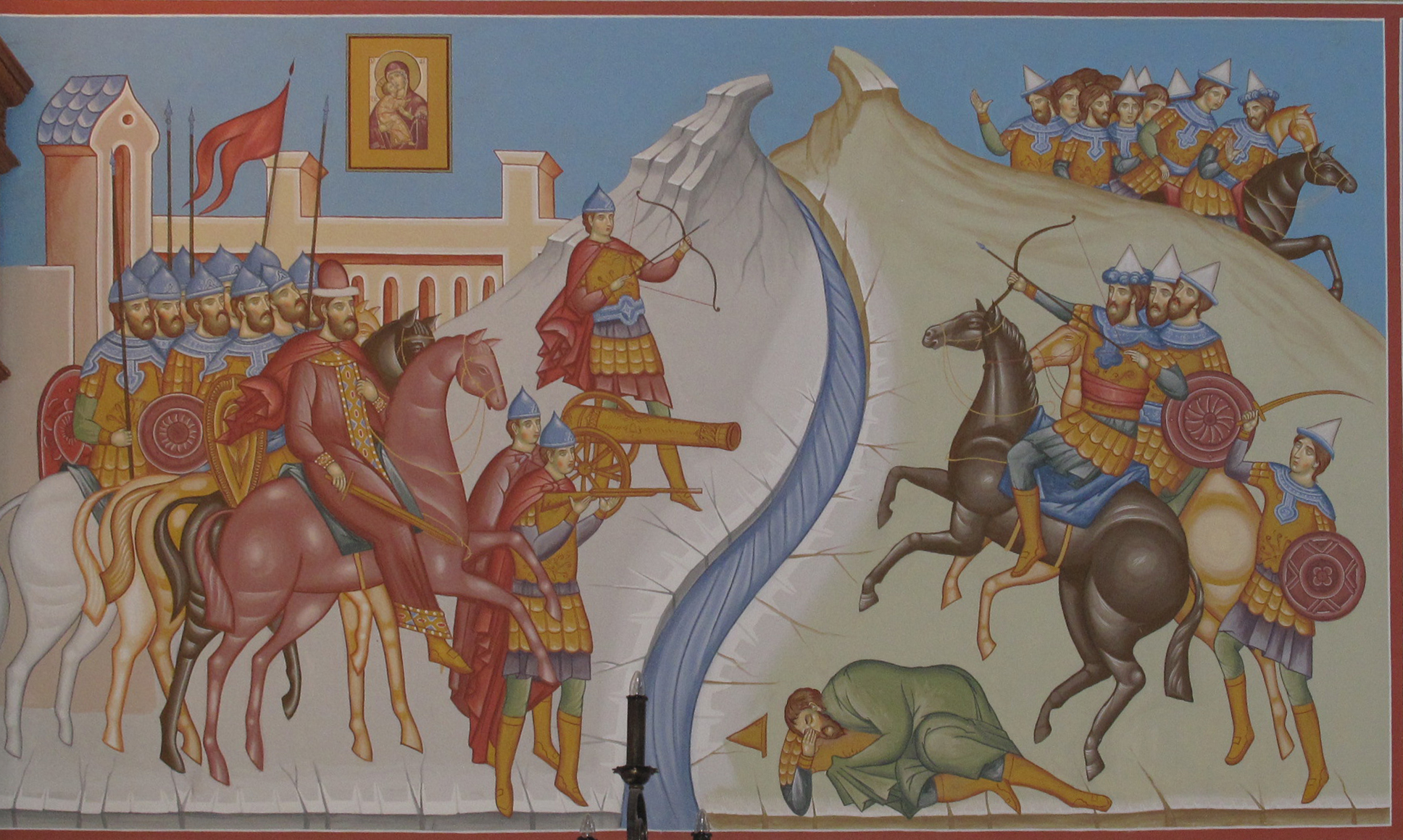 И, конечно, взгляд невольно охватывает всю Угру. На холсте, как и тогда в XV веке, река разделяет ордынскую рать и московские полки. Из летописей известно, что многие чудесные события во время Великого стояния произошли под покровительством Божьей Матери. Именно поэтому Угра после победы над ордынцами стала называться Поясом Пресвятой Богородицы. Летописец так сообщает об этом: «…и могу нарещи ту реку (Угру) пояс самыя Пресвятыя Богородицы, аки твердь от поганых защищающу Русскую землю». Почему же это великое событие на Угре до сего времени относится к разряду недооцененных в истории? Лишь потому, что земля глубоко не пропиталась кровью погибших за Отечество его сынов, или потому, что тогда не случилось жестоких сражений? Но ведь огромная ценность самой военной кампании в том и заключается, что благодаря искусной оборонительной стратегии Великого Московского князя Ивана III, который вынуждал хана Ахмата вступать в бой в невыгодных для ордынцев условиях, удалось сохранить многие тысячи жизней русских защитников!