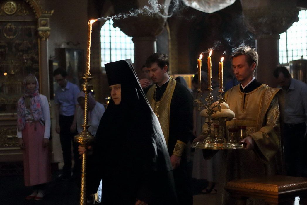 «Как оказалось, самое страшное в Новодевичьем монастыре – это ходить со свечой. Во время богослужения зажженная свеча на высоком подсвечнике, стоящем на полу, символизирует собой пророка Иоанна Предтечу, поэтому сестра-церковница должна идти со свечой перед символизирующем Спасителя Евангелием, которое выносят из алтаря священнослужители. Свеча с подсвечником не очень тяжелая, но поднимать ее не всегда удобно из-за окаймляющих подсвечник украшений из живых цветов.