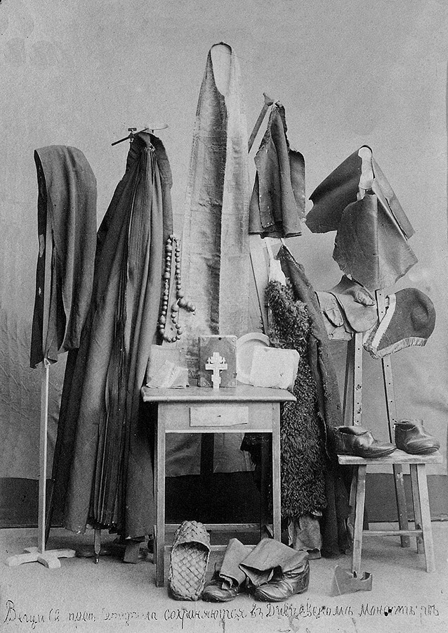В витрине хранятся его вещи ‒ все, что после него земного осталось. Епитрахиль его, поручи, его лапотки, его полумантия, в которой он ходил постоянно, Псалтирь его, которую он всегда в мешочке носил за спиной с другими книгами Священного Писания, топорик, на который он опирался и которым работал... Какое-то особое тонкое благоухание исходит от этих вещей, и когда, бывало, положишь голову, зароешься лицом в какой-нибудь полушубок или мантию, так и кажется тебе, что ласковый, старческий голос шепчет над ухом: «Ну что, радость моя? Зачем пришел к убогому Серафиму?»
