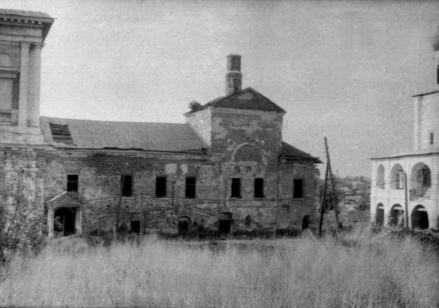 В начале Великой Отечественной в монастыре размещался 157-й Отдельный батальон аэродромного обслуживания. Как уже отмечалось, благодать хранила святыню от вражеских снарядов. А вот перед варварством граждан некогда Святой Руси обитель оказалась беззащитной. После войны сюда вселились всяческие конторы, организации и учреждения, склады, гаражи, коммунальные квартиры, здесь же были устроены загоны для скота. Некогда столь изящные строения монастырского комплекса ветшали и разрушались. К середине 1960-х годов три башни и большая часть стен обвалились. О Покровском храме в то время вспоминают так: «Западная часть его сгорела, купол был снесен, пол выломан, в стенах зияли пробоины, штукатурка снаружи и внутри полностью отсутствовала, кирпичная кладка рассыпалась». В таком же аварийном состоянии пребывали тогда все постройки.