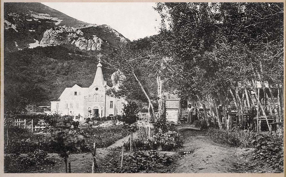 История возникновения обители связана и с именем святого праведного Иоанна Кронштадтского. Дважды встречался в Кронштадте с великим молитвенником иеромонах Иоанн со Святой Горы Афон, направленный вместе с собратом, монахом Сергием, в Россию для поиска места и средств на строительство подворья Иоанно-Богословской келии Русского Пантелеимонова монастыря.  Заболевший в пути монах Сергий отправился на водолечение в Пятигорск, иеромонах Иоанн – в Петербург, для встречи с церковными иерархами. Заехал он и в Кронштадт. В первую встречу отец Иоанн Кронштадтский благословил устроение новой обители на Кавказе. Во время второй –монах Иоанн показал Кронштадтскому пастырю фотографию местности. И дерзновенный подвижник крестом указал на карте место, где следует построить первый монастырский храм. Место было не просто живописным. Здесь, по преданию, во времена древней Алании (IX век) существовала византийская обитель. Так что, спустя века, отмеченные кровопролитными войнами, скорбями, болезнями, укреплением, а затем упадком истинной веры, это было второе рождение монастыря. В праздник Успения Пресвятой Богородицы в 1904 году состоялось его освящение. Третье рождение – полнокровную жизнь с монашеской молитвой, устремленной в небо, – дотла разрушенный монастырь получил уже в нашем веке. И снова его освящение совершилось в день престольного торжества, 28 августа. Это был 2001 год, и снова монастырь стал стражем Православия на Северном Кавказе.